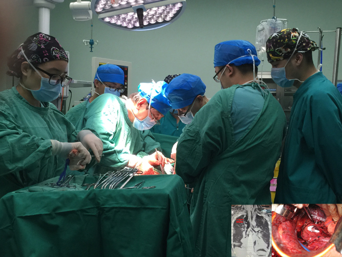 患者进入手术室,麻醉师马国学和宋闯准确、顺利地插入双腔气管导管,避免了多次插管带来的副损伤,体现了过硬的技术功底。由于气管破裂处血块和痰液阻塞气道,血氧饱和度一直徘徊在低水平,不耐受一侧肺通气,无法实施手术。时针在转动,大家心急如焚!麻醉科吴迪主任从家中赶来,采用多种措施解决了难题,经过 2个多小时的努力,单肺通气下血氧终于能维持在95%以上了。